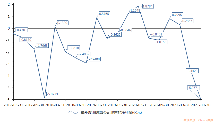 当晚,该公司披露2021年全年业绩预告称,预计2021年年度归属于上市公司股东的净利润为-18亿元到-20.38亿元,与上年同期(法定披露数据)0.82亿元相比,将减少金额约为18.82亿元到21.20亿元;同时,预计2021年年度归属于上市公司股东扣除非经常性损益的净利润约-18.2亿元到-20.58亿元,与上年同期(法定披露数据)-0.46亿元相比,将减少金额约为17.74亿元到20.12亿元。