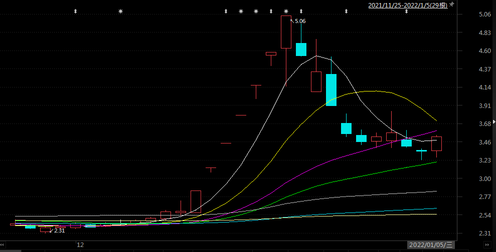 随着煤炭价格下行,金山股份股价开始迅猛回升。界面新闻获悉,该公司股价从2021年12月13日至12月21日连续收获7个涨停板。不过,在冲至5.06元/股高位后,金山股份的股价却开始大幅下滑,到2022年1月5日跌至3.53元/股,跌幅超30%。