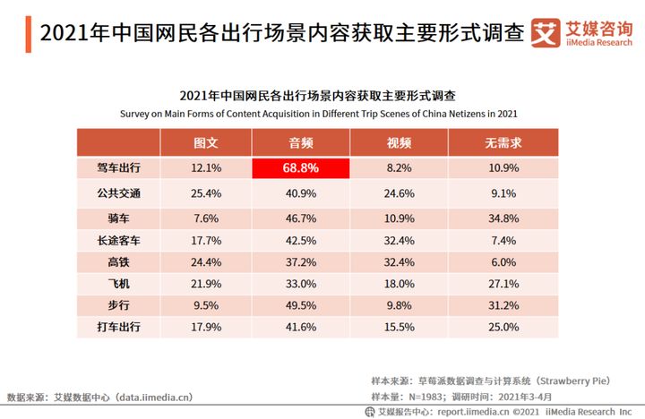 艾媒咨询数据显示,各出行场景中,车载端音频形式获取内容的用户占比最高,达到68.8%。艾媒咨询分析师认为,出行属于典型的伴随性场景,音频是内容获取的最主要方式,且替代性低。