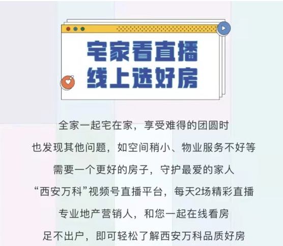西安万科推出视频号直播时段,邀请专业地产人带众多客户在线云看房,聊房,每天2场,既为广大居家市民提供了新的信息娱乐方式,也全面推广了品质好房。同时,还推出“万福券”,购房立减2万元、享99折特惠、限量特价房等等。
