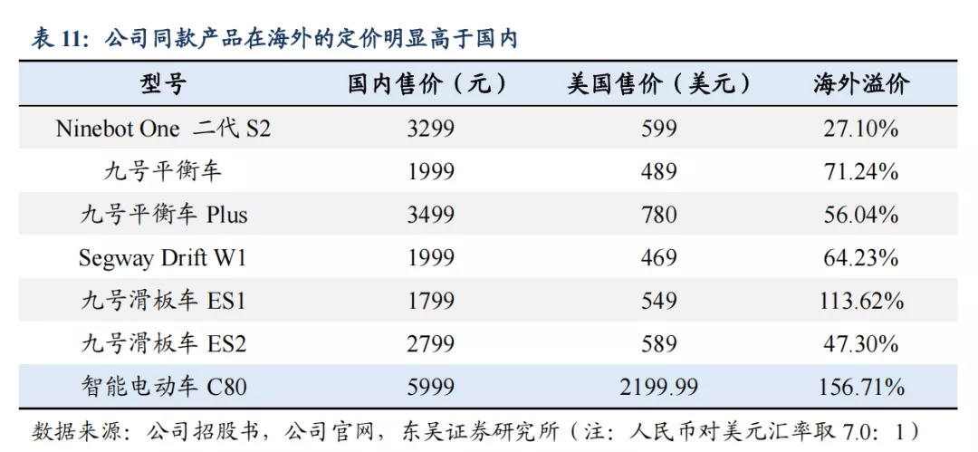鉴于欧美市场良好的竞争格局,以及对产品价格敏感度较低,九号公司的智能消费产品在欧美拥有更大的溢价权。从历史售价来看,公司同款电动平衡车和滑板车在美国的售价相较国内平均溢价50%以上,如九号滑板车ES1定价549美元,相较国内售价1799元人民币溢价达到113.62%。