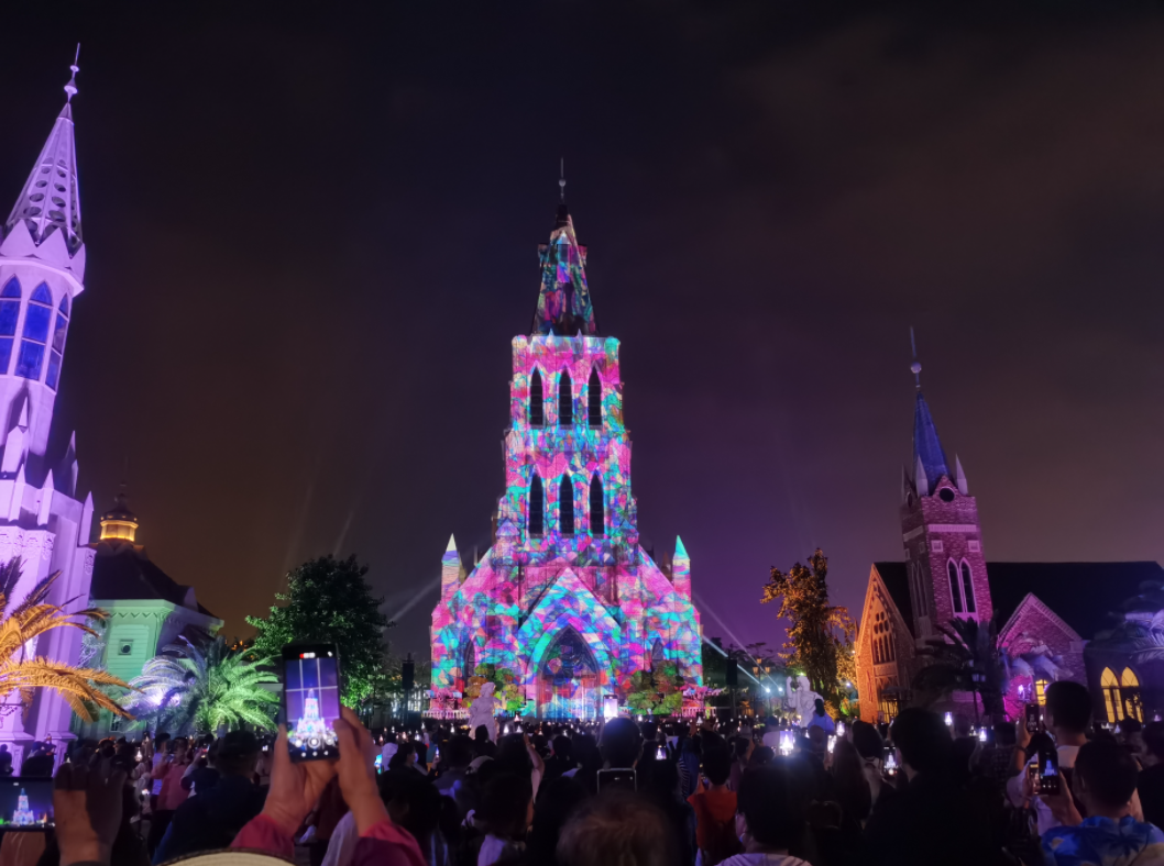 灯光秀是当前海花岛上人气最旺的节目,目前每晚8点半和9点半有两场表演,最佳观赏点是观光塔、位于风情商业街的婚礼庄园以及希尔顿酒店,大多数游客只能聚集在婚礼庄园,观光塔并未对外开放。