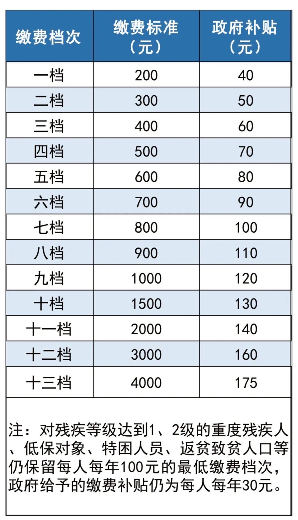 对残疾等级达到1、2级的重度残疾人、低保对象、特困人员、返贫致贫人口等仍保留每人每年100元的最低缴费档次,政府给予的缴费补贴仍为每人每年30元。