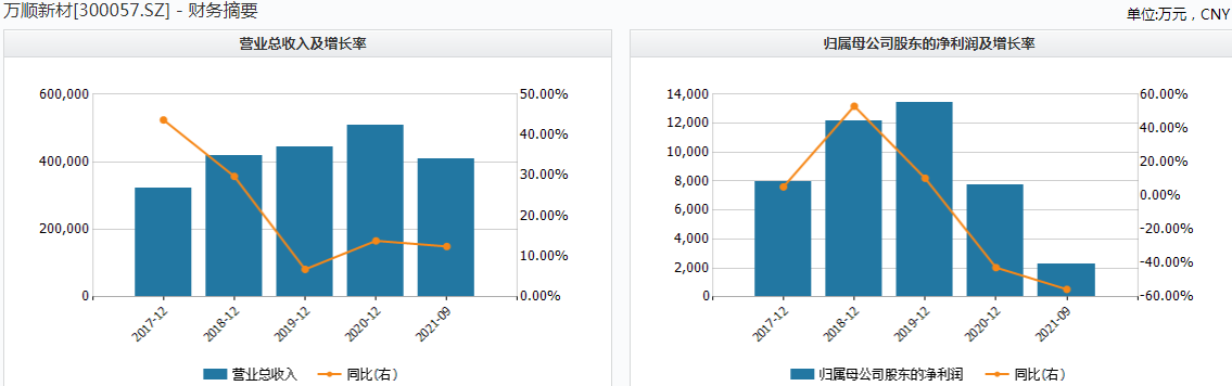 遗憾的是,随着收入规模扩大,万顺新材的利润却持续走低。财务数据显示,2019年、2020年及2021年前9月,该公司实现营业收入分别是44.52亿元、50.69亿元、40.74亿元,同期实现归母净利润分别是1.34亿元、7710.73万元、2227.13万元,2020年、2021年前三季度盈利额分别同比跌42.62%、55.52%。