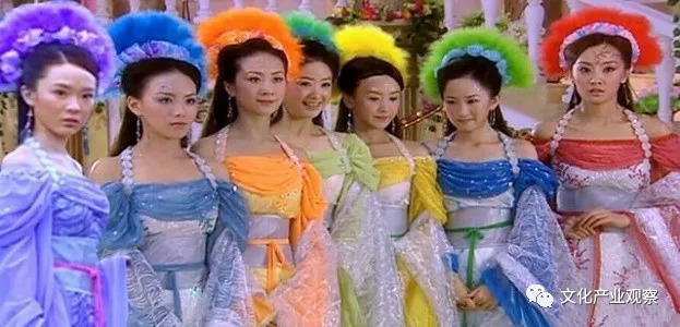 其次是服饰的变化。港台剧与内地的碰撞给予人们新的思考,造型师们逐渐开始运用起纱、蕾丝等纱裙做大裙摆,典型代表就是《欢天喜地七仙女》。