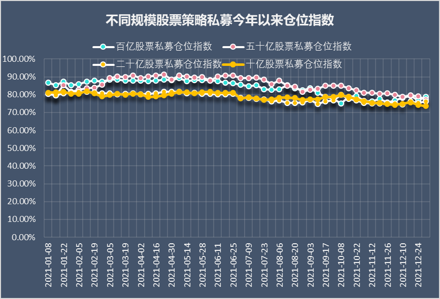 此外,从加减仓意愿来看,百亿级私募2021年底加仓意愿最为强烈,环比加仓了1.74%,同样表现出加仓意愿的还有二十亿级规模股票私募,其仓位指数环比上升了0.82%。五十亿级和十亿级规模股票私募则较为悲观,仓位指数环比出现了下降,其中五十亿级规模股票私募仓位下降幅度最大,环比降低了1.72%。