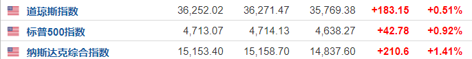截至收盘,标普500收涨0.92%,报4713.07点,终结五日连跌。道指收涨0.51%,报36252.02点。纳指收涨1.41%,报15153.40点,连涨两日。
