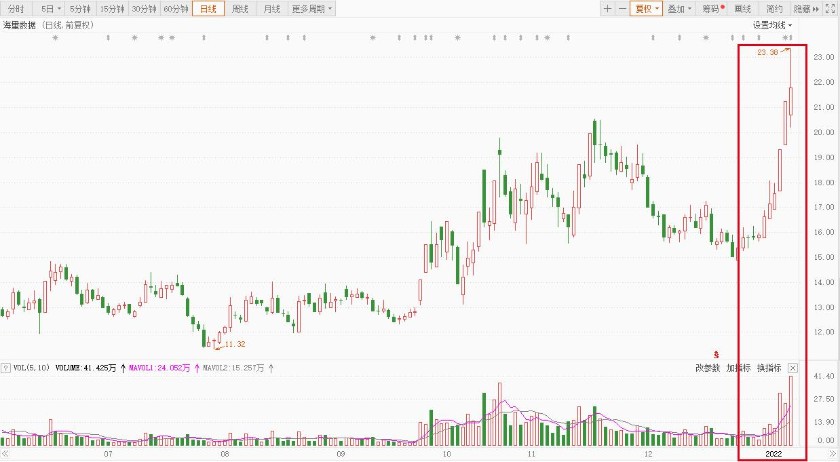 2022年元旦假期结束后,海量数据在1月4日开市起突然拉涨,从当日最低的15.77元在几个交易日之内涨到了23.38元的阶段新高,六个交易日的最低点与最高点之间涨幅达48.26%。