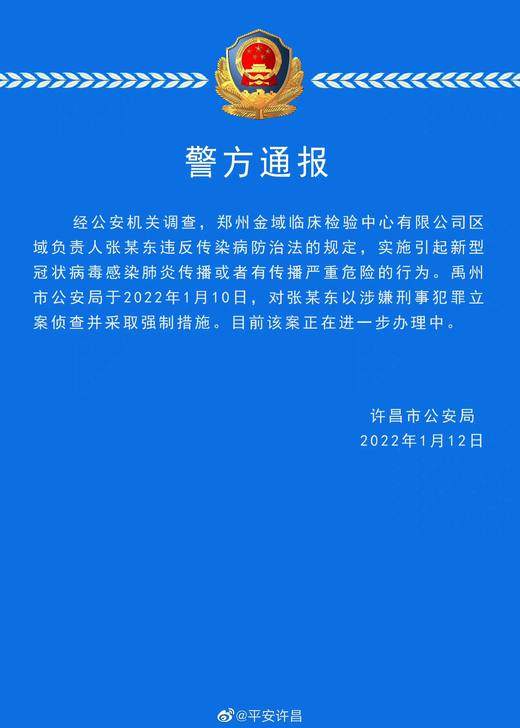 1月12日,河南省许昌市公安局通报,郑州金域临床检验中心有限公司(以下简称为“郑州金域”)区域负责人张某东违反传染病防治法规定,实施引起新型冠状病毒感染肺炎传播或者有传播严重危险的行为。禹州市公安局于1月10日,对张某东以涉嫌刑事犯罪立案侦查并采取强制措施。目前该案正在进一步办理中。