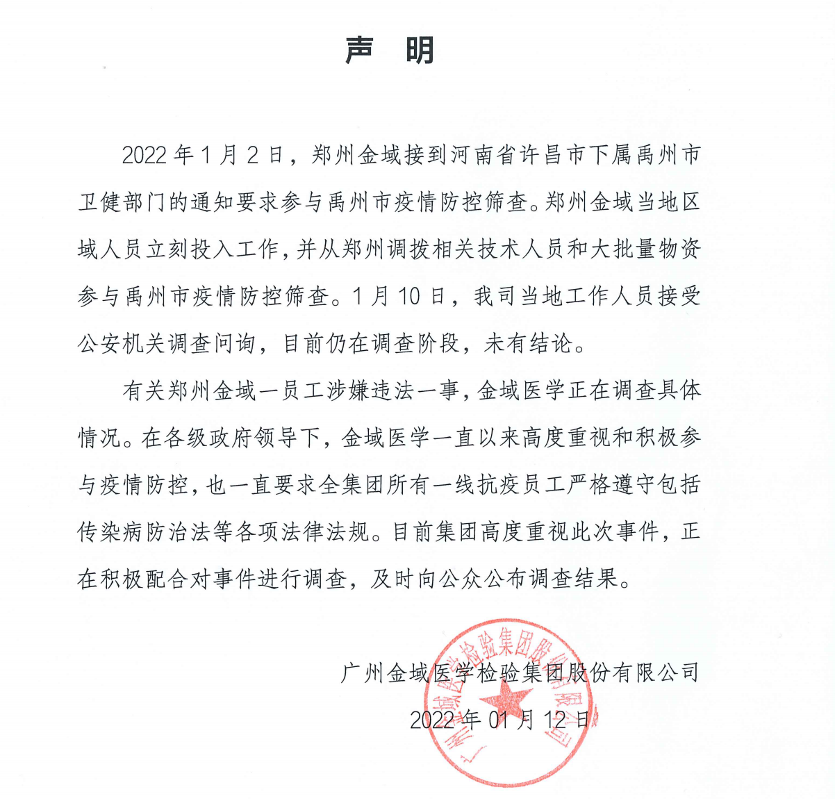 1月2日,郑州金域接到河南省许昌市下属禹州市卫健部门的通知要求参与禹州市疫情防控筛查。郑州金域当地区域人员立刻投入工作,并从郑州调拨相关技术人员和大批量物资参与禹州市疫情防控筛查。1月10日,我司当地工作人员接受公安机关调查问询,目前仍在调查阶段,未有结论。
