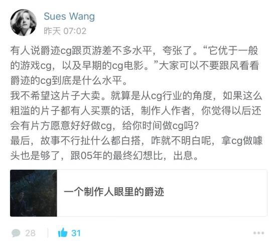现在,《爵迹》继续延续人气明星撑场子基调,依靠技术噱头,掩饰影片内容、演技硬伤。这种故弄玄虚手法,在广大网友眼里是不能容忍的。加之,《爵迹》预告片效果确实有不足之处,网友吐槽就犹如万箭齐发。