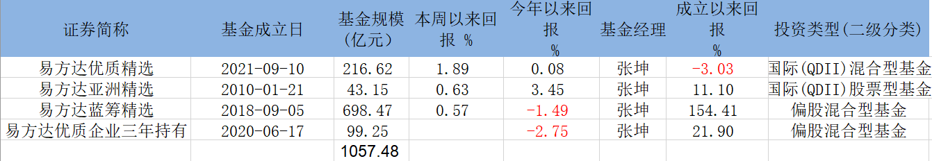 昨日晚间,已经有基民奔走相告,欣喜地发现“公募一哥”张坤管理的两只QDII基金:易方达优质精选、易方达亚洲精选今年以来的收益率已经翻红,尤其是从易方达中小盘改名而来的优质精选,这只216亿规模的巨无霸,本周以来的收益率为1.89%,今年以来的收益率为0.08%。