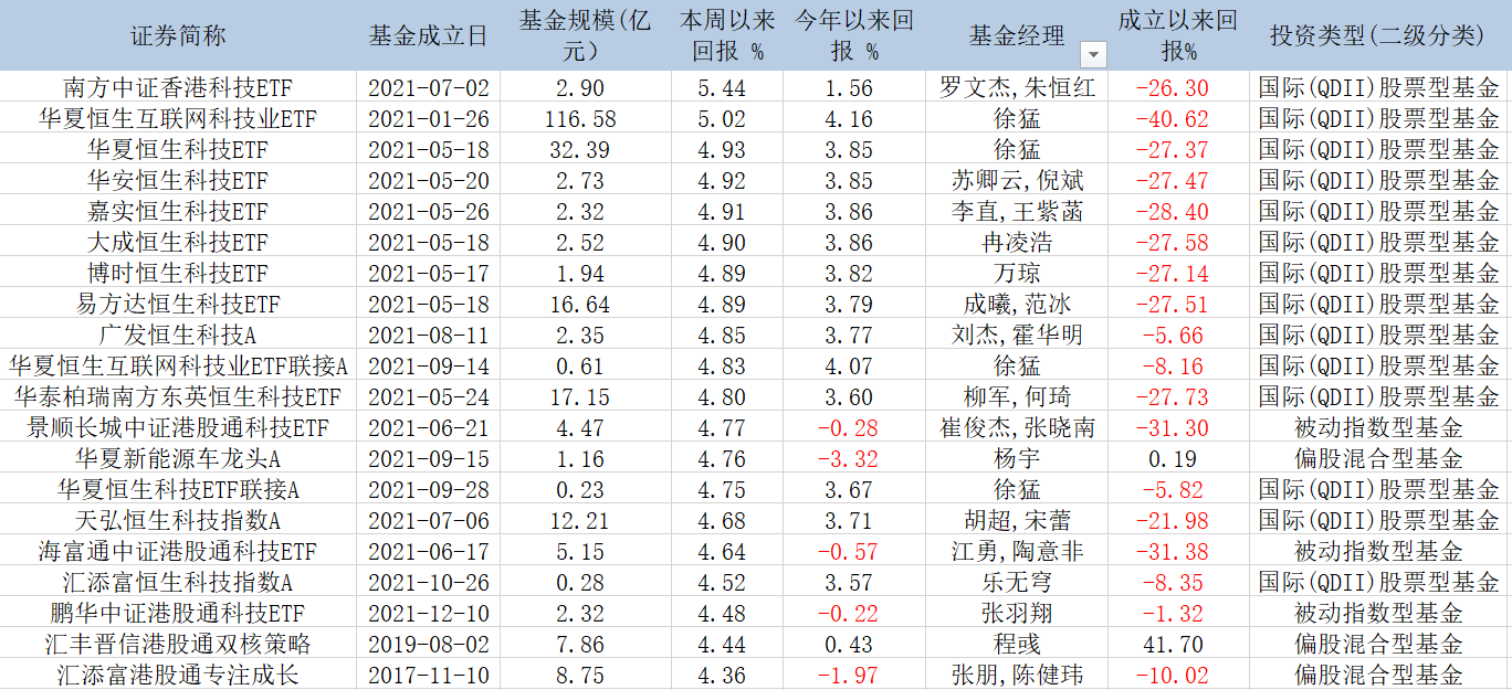 Wind数据显示,受到恒生指数的强势反弹,仅昨日一天,就有南方中证香港科技ETF、华夏恒生互联网科技业ETF两只QDII基金涨幅超过5%,位居全市场前两位。