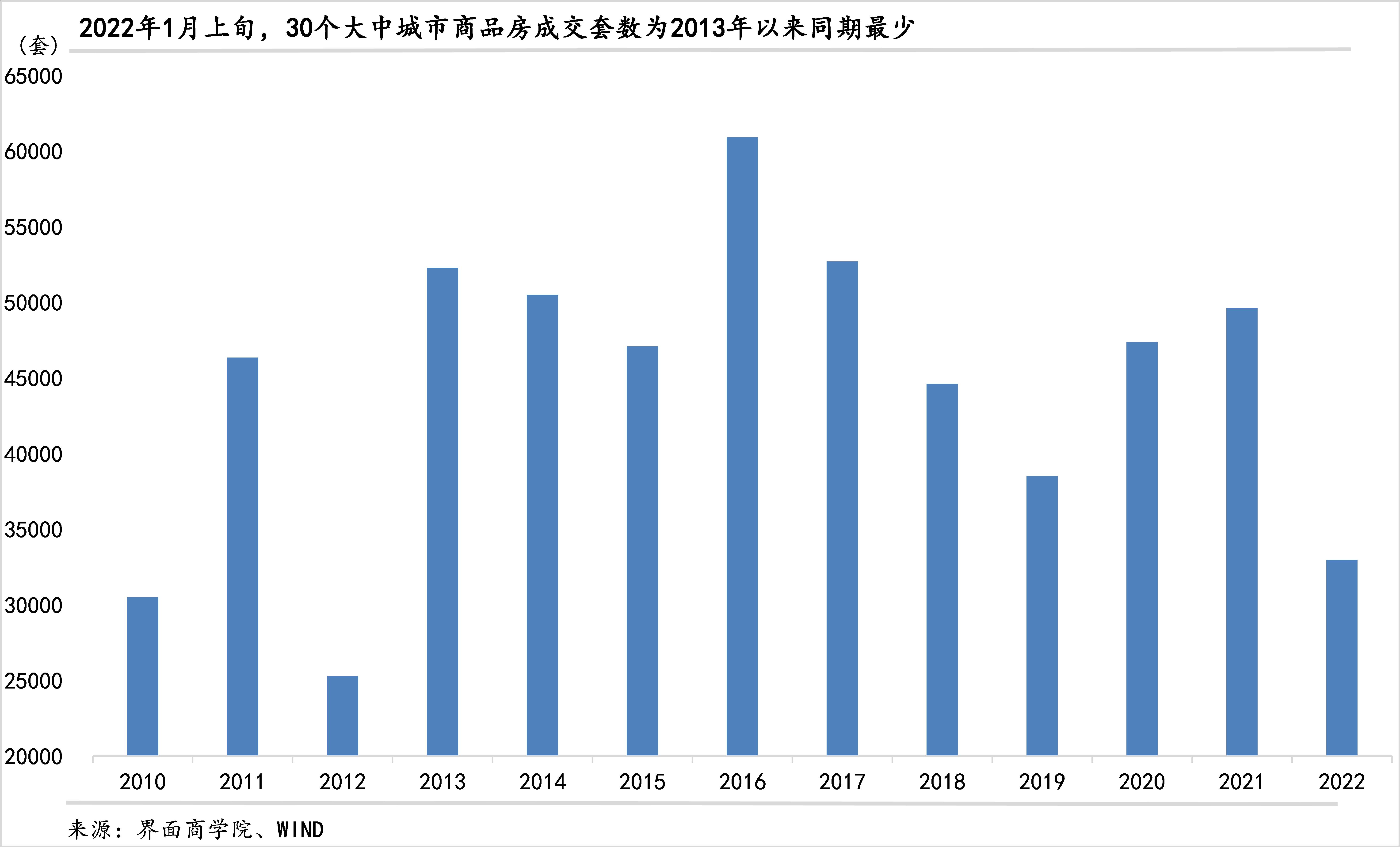 2022年初以来,商品房销售同比继续负增长,且同比降幅加大。界面商学院计算了2010年以来1月上旬商品房成交套数,可以发现,2022年1-10日成交套数为2013年以来最少,仅超过2010、2012年(分别高出8%、30%)。