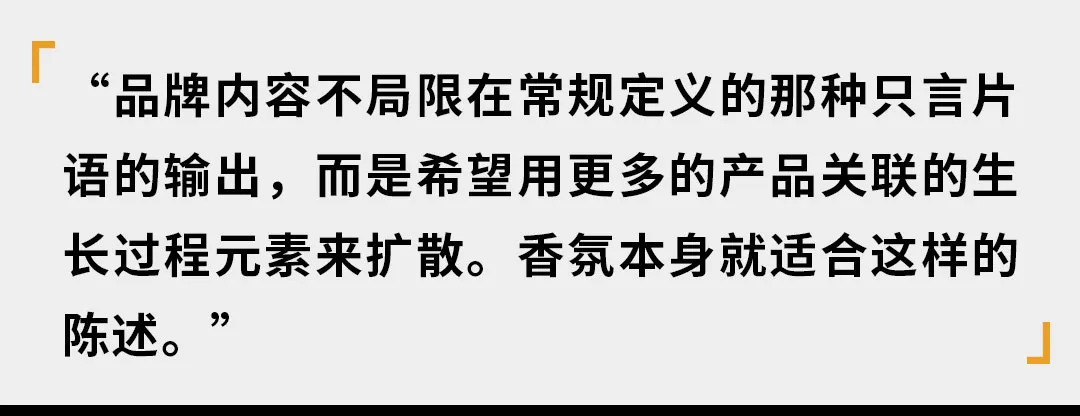 “香水香氛所产生的气味,本身就是感性的介质,而我们现在正在做的就是关于构建香水与青年文化和潮流文化这本身就十分感性的内容之间的桥梁。我们所探究的是和情绪、文化这些意识形态的表达式,这不是某个地域,某个香料可以表达的。”
