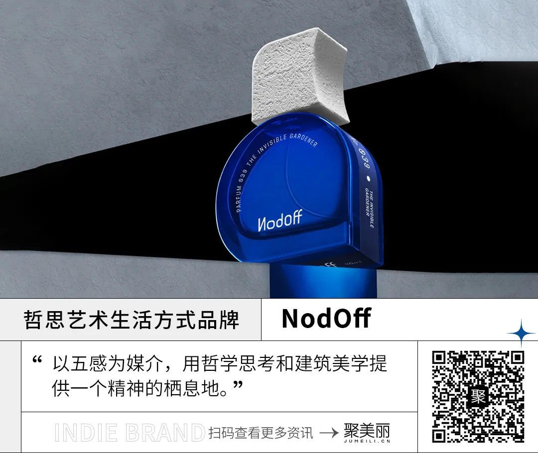 举例来说,在香氛设计上,团队基于品牌基因去描述场景和五感融合,叠加了不同个性的香料;在瓶器设计,团队设计了独特的外形,同时搭配特殊材质和工艺去打造独特的视觉和触觉印象;在颜色选择上,团队选择了黑、白、灰三个基础色搭配纯净的蓝;在内容设计上,团队在公众号上推出产品时,沉浸式地用听觉和视觉去呈现NodOff的场域,比如看不见的园丁就是割草声、贝克莱的柿子就是咬一口柿子的声音,以此来形成感官上的共感去联想、感受香氛。