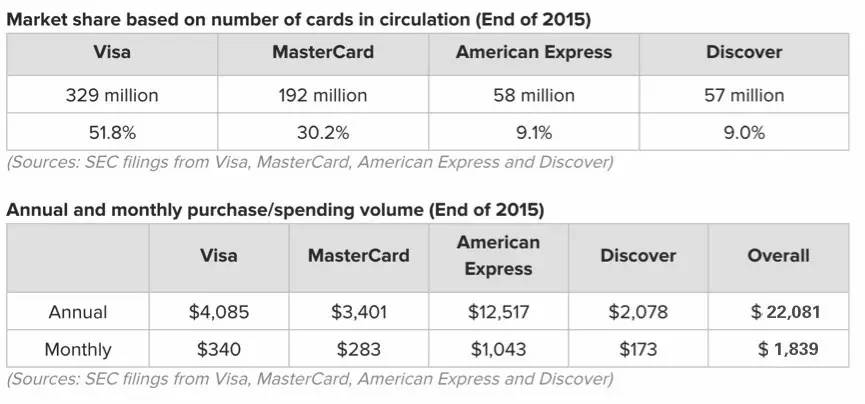 在支付网络环节,全美共有四家公司:Visa, MasterCard, American Express, Discover(类似中国的银联、日本的JCB),份额如下图所示: