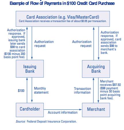 信用卡发卡行首先会进行信息的审核和批准,收取约2%的手续费(interchange fee),之后Visa, MasterCard等支付网络收取约0.05%的通道费,收单行再收取约0.5%的手续费,最终进入收款方账户的金额大约是付款额的97.5%。