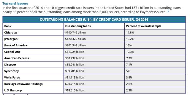 我们将其简单分为两类,即花旗银行、摩根大通等业务种类丰富的大型综合银行集团,和其他专营借贷和信贷服务的金融机构,如American Express美国运通、Capital One第一资本等。此外,美国信用卡行业也较为集中,前十大发卡行已经占据了85%的市场份额(2014’)