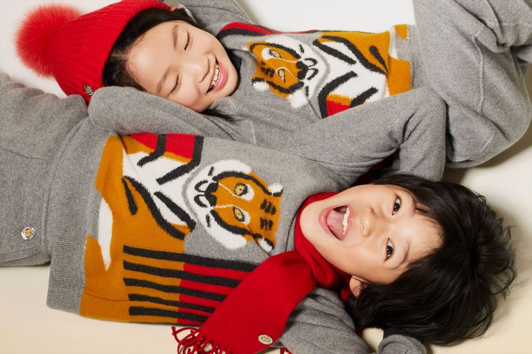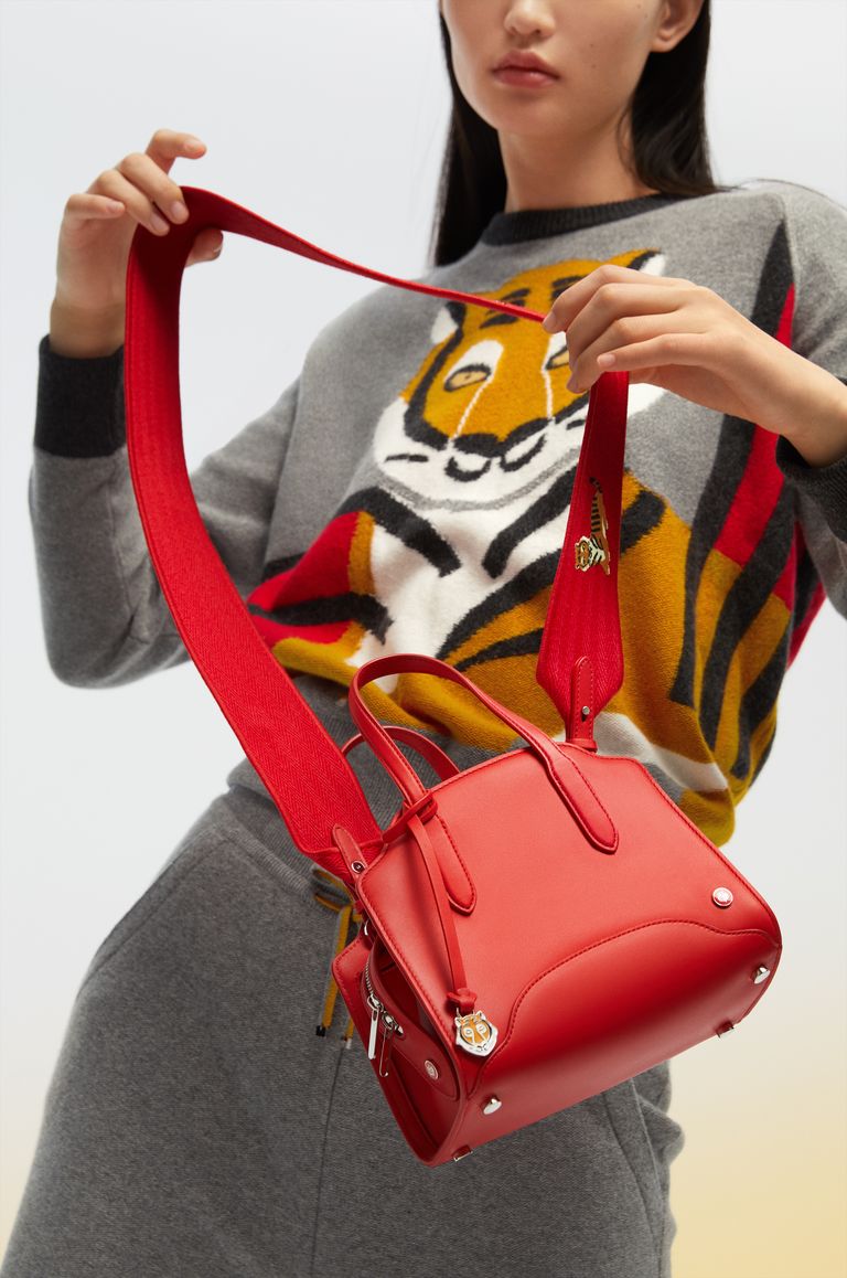 Loro Piana也选择了中国红和威风凛凛的老虎图腾来演绎虎年新春系列,老虎图案或醒目地盘踞在服饰的C位,或以标签挂饰的形式装点在手袋或围巾上,霸气外露。这一系列涵盖男女装和童装,不失为新年家庭装的不错选择。