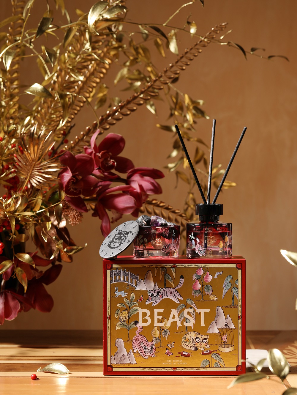 野兽派“醉虎下山”系列将果香与酒香交织,引得老虎贪杯,醉眼朦胧下山来。系列包含香水、超大香槟桶蜡烛、香薰礼炮等香氛产品,不失为团圆夜增加气氛的好选择。除了香氛,系列还包含虎头帽、虎头围巾、长条虎抱枕等等活泼且治愈的单品,为你的家居装饰添彩。