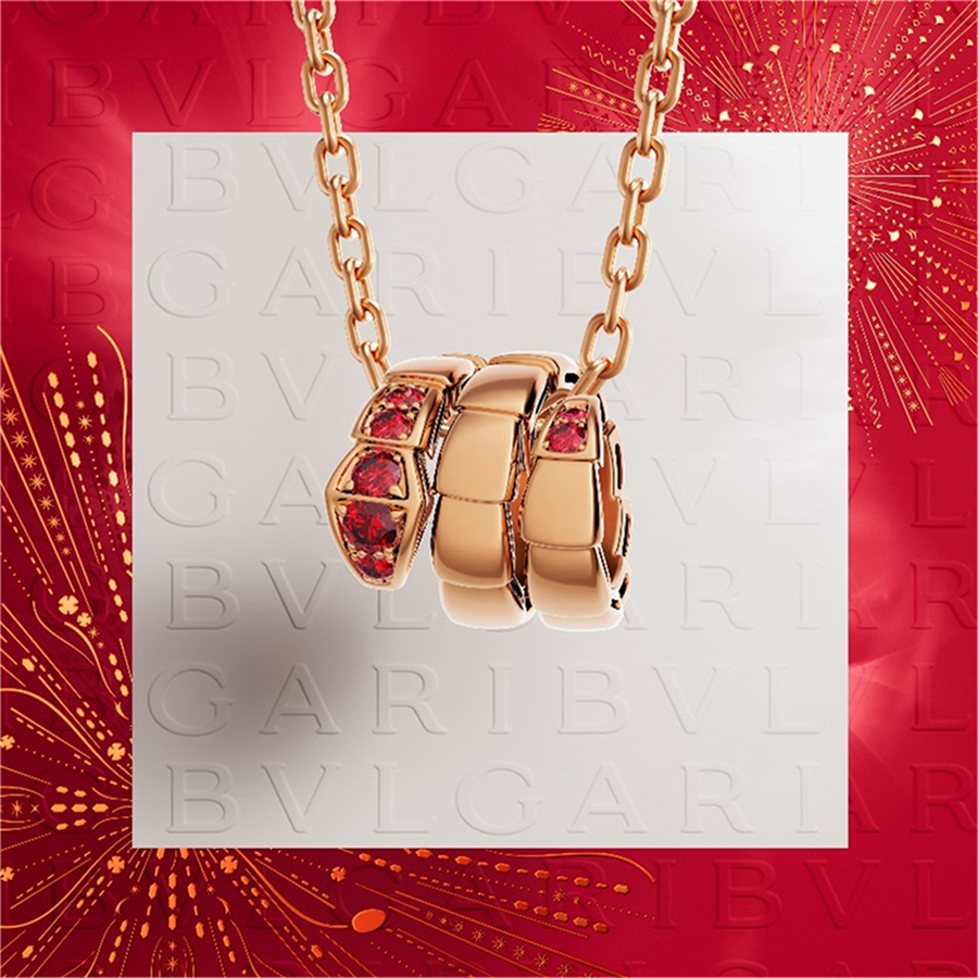 BVLGARI宝格丽Serpenti Viper新年特别款项链以层次鲜明的几何图案雕琢出品牌标志性的灵蛇造型,蛇身上首尾相连的红宝石寄托着对新年的祝福——祝你红运当头,喜笑连连。
