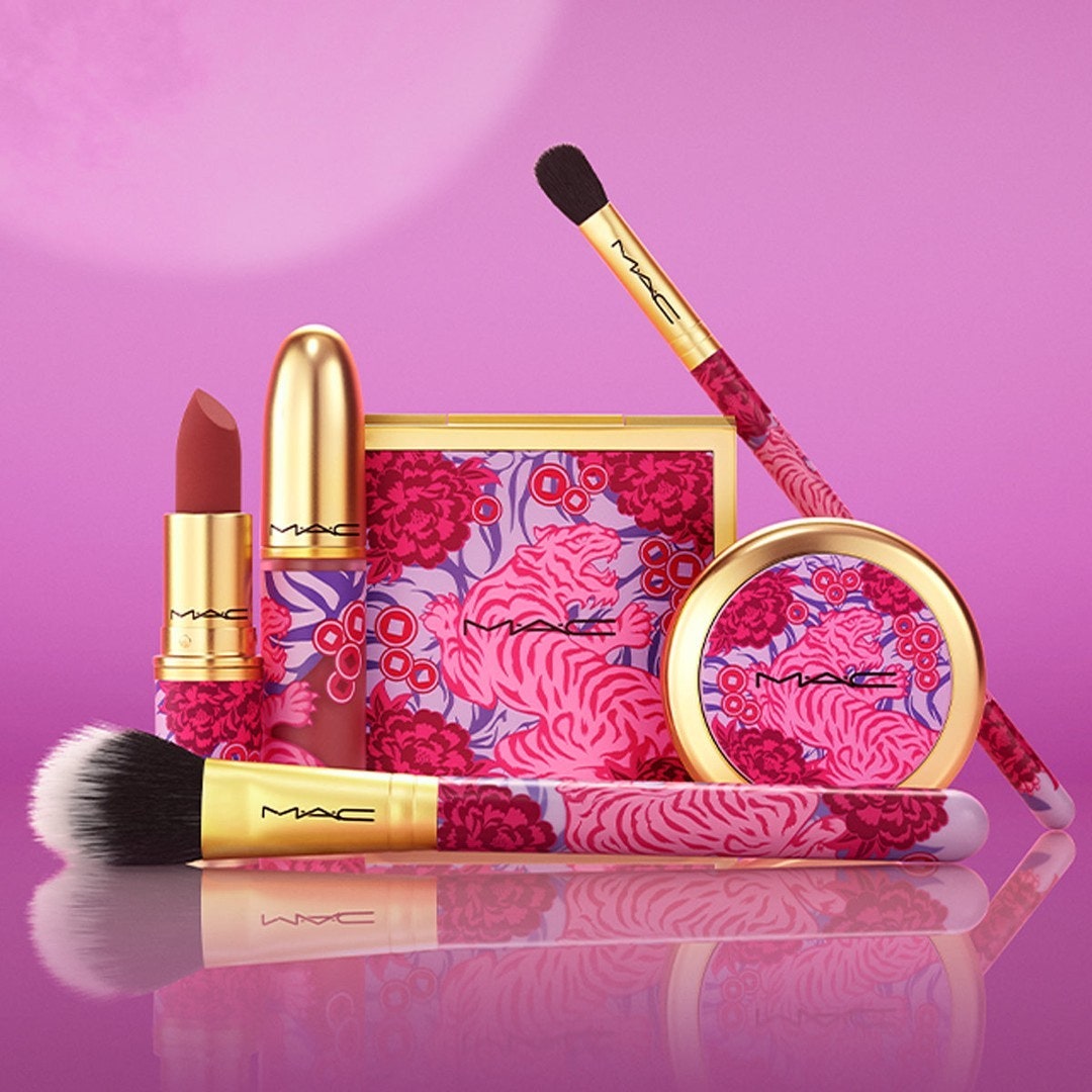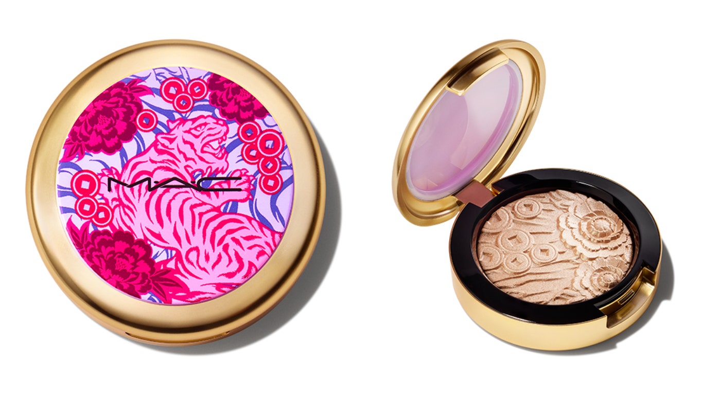 同样是牡丹配老虎,M‧A‧C选择了刺绣风的牡丹来演绎人气产品,让设计更具东方韵味。这一融合紫、金、红配色的新年限量系列还被命名为“紫醉金迷”,甚至连生姜高光上都被压上了铜钱和牡丹的印花,可见其对招财的美好祝福。