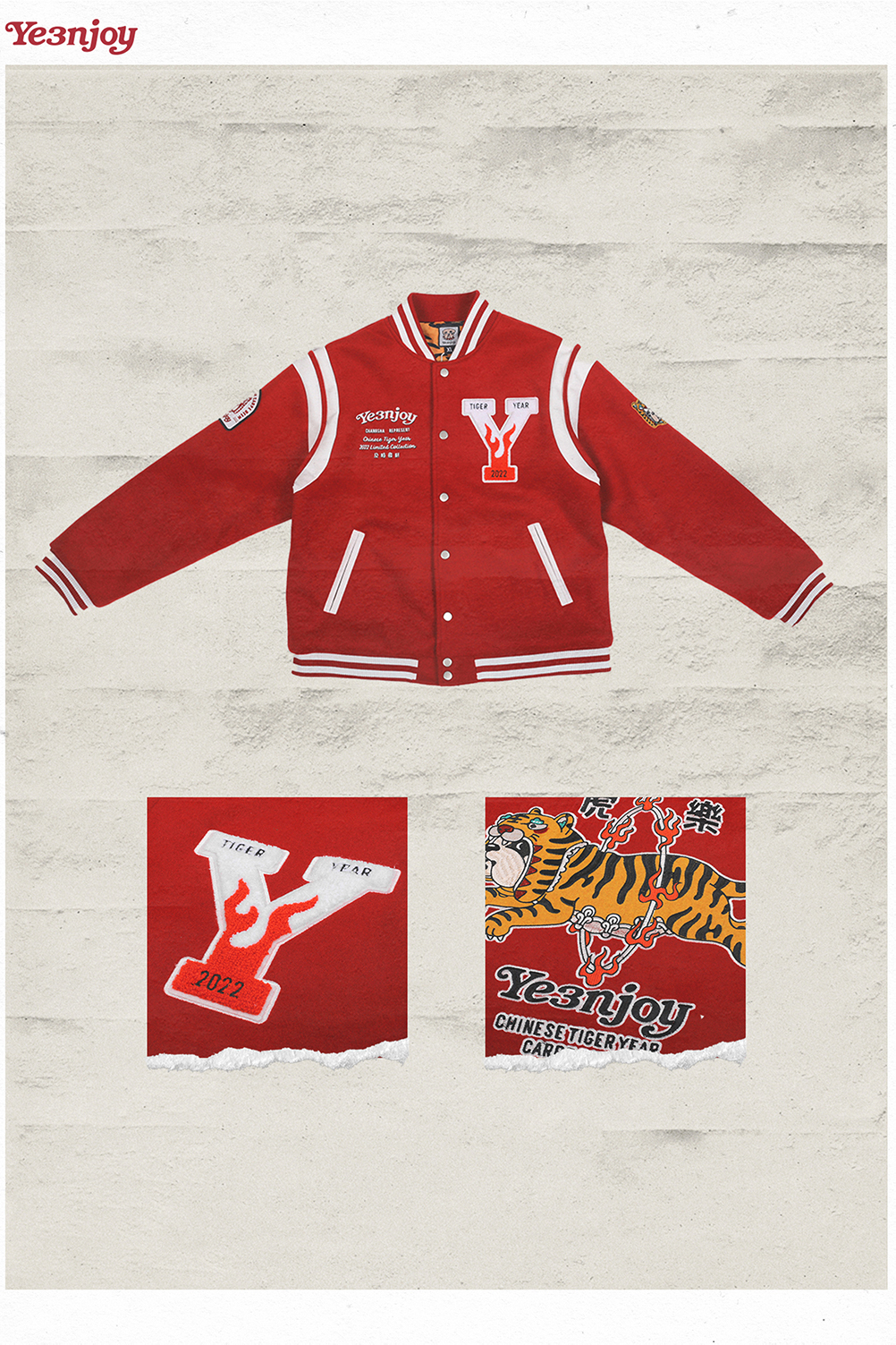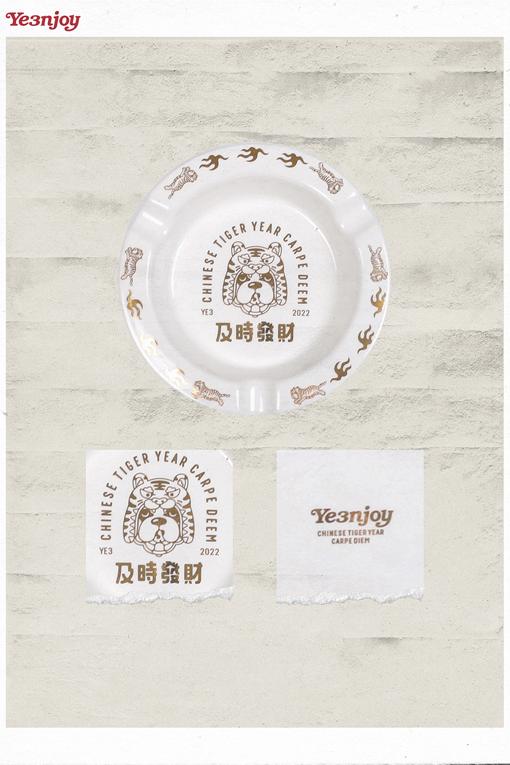若是你觉得只是盘踞或者踱步的老虎还不够有趣,那跳火圈的老虎或许能戳中你的心意?YE3NJOY把品牌标志性的斗牛犬和复古插画风格,与生肖虎元素结合起来,将披上老虎外套的斗牛犬拉去参加一场杂技表演,以幽默诙谐的方式祝愿大家“及时发财”。