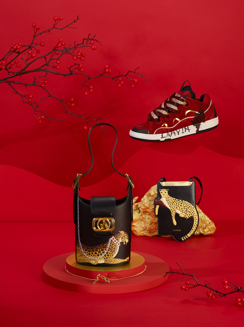 LANVIN偏要选择老虎的亲戚——同为猫科动物的豹猫作为新春胶囊系列的主角。新系列在延续品牌基因中“猫”元素的同时,也寓意着“招财进‘豹’”。系列涵盖卫衣、针织衫、连衣裙、手袋等单品,其上均带有“钱豹”、“中国红”、“招财进宝”、“福”字等新春元素。