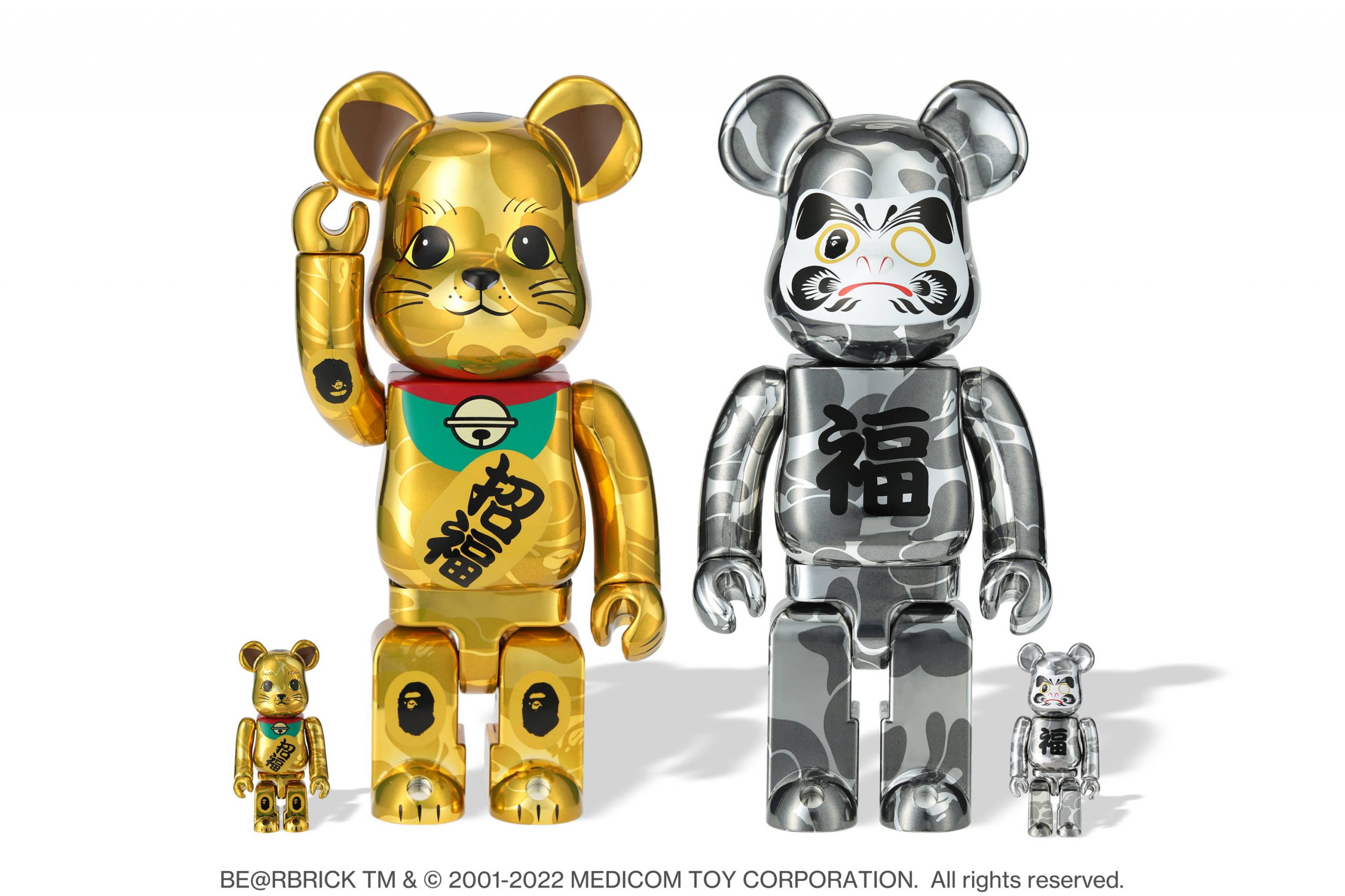 若是想要个特别版的招财猫,你还可以看看积木熊的新年限定款。A BATHING APE®今年与MEDICOM TOY合作推出了两款新年特别联名BE@RBRICK,主题是“招财猫”和“达摩”,分别采用金银配色,身上还写有“招福”和“福”字。