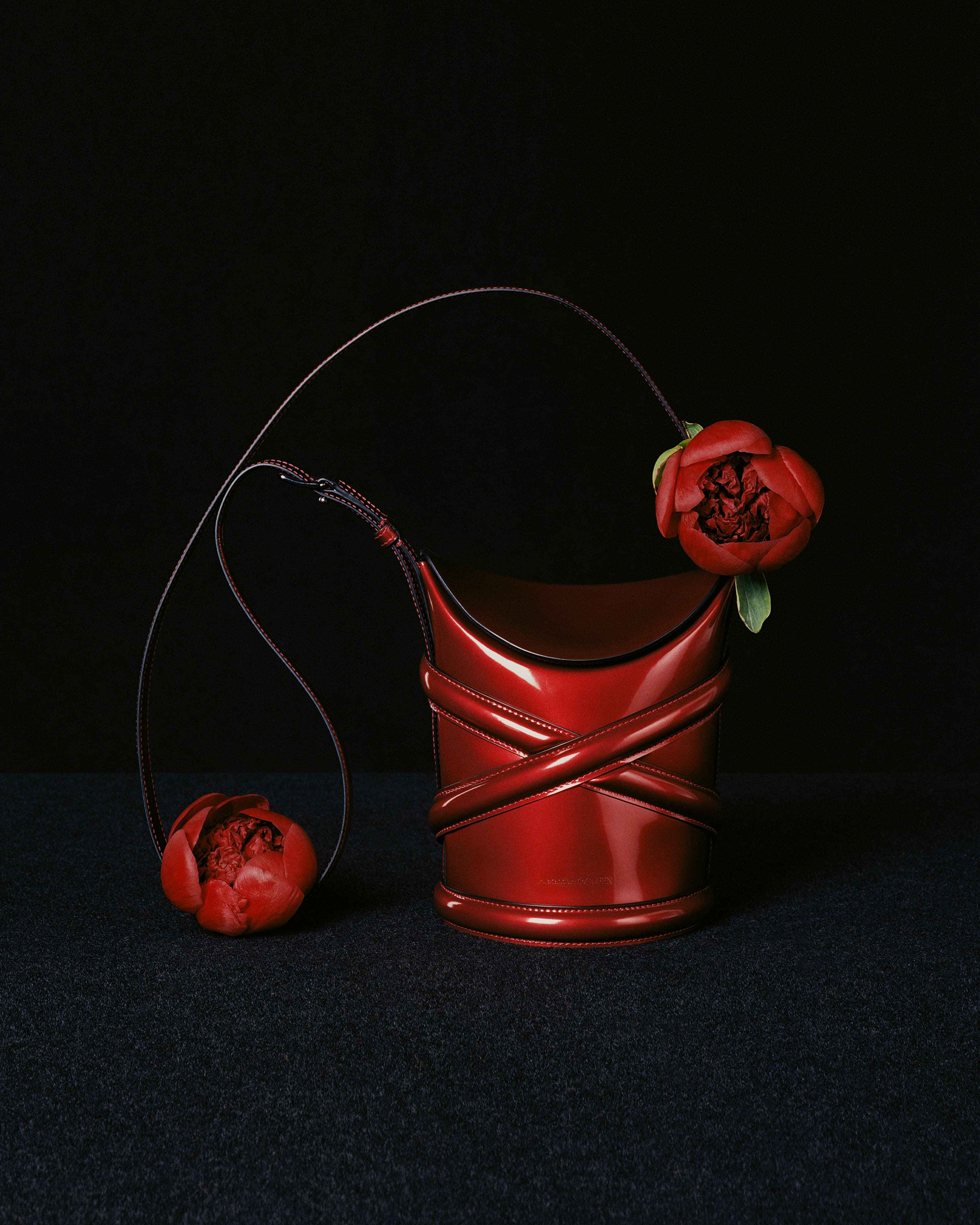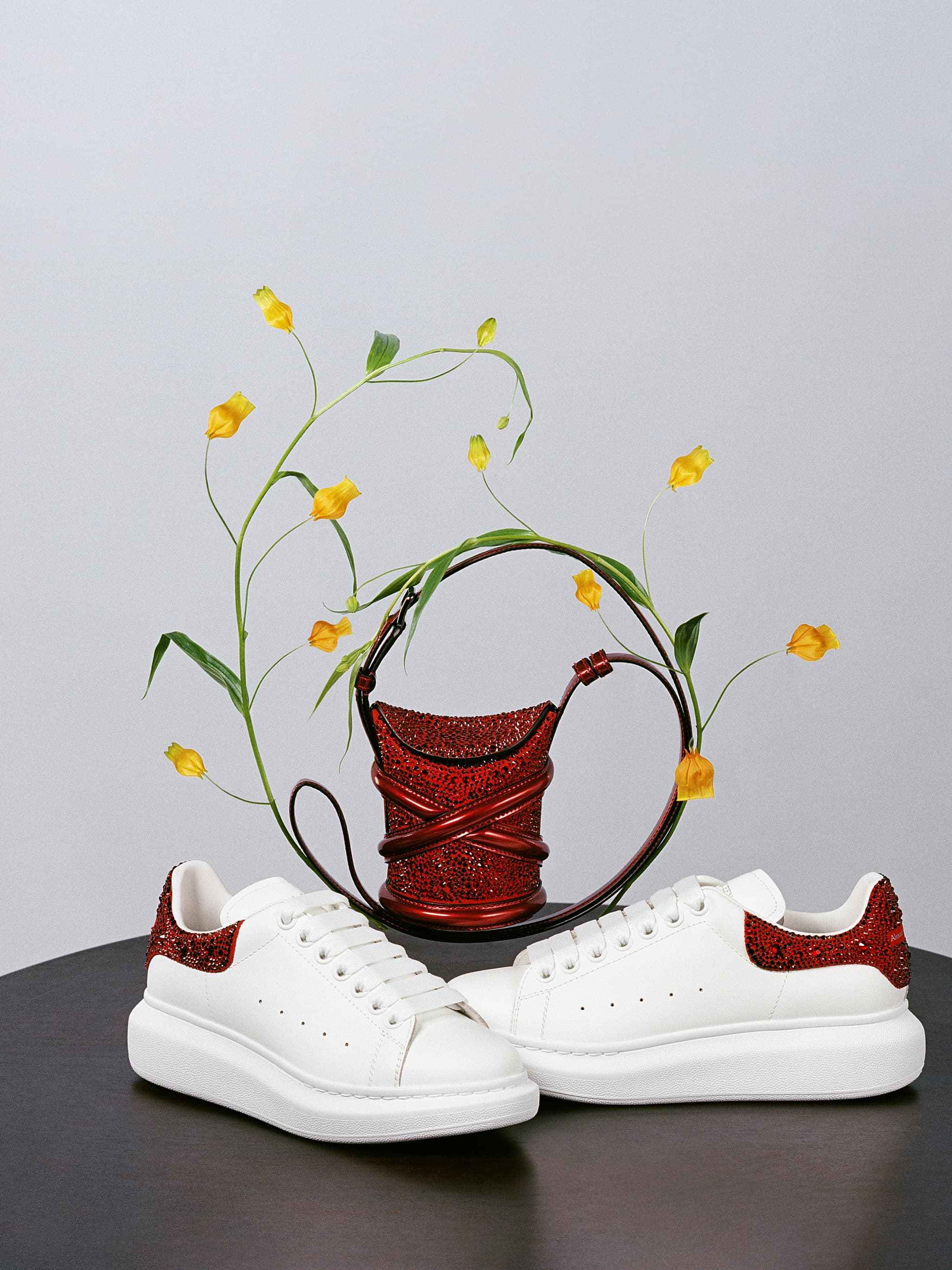 Alexander McQueen的2022中国新年限定系列也没有“虎”。系列对寓意好运的中国红元素加以创新,融合金属光感皮质和耀眼水钻等细节,让品牌经典单品华丽又应景。The Curve手袋以金属光感皮革或闪耀水钻通体装饰。Oversize Sneaker鞋款则以白色皮革和红色后跟细节装饰,制造强烈风格对比。