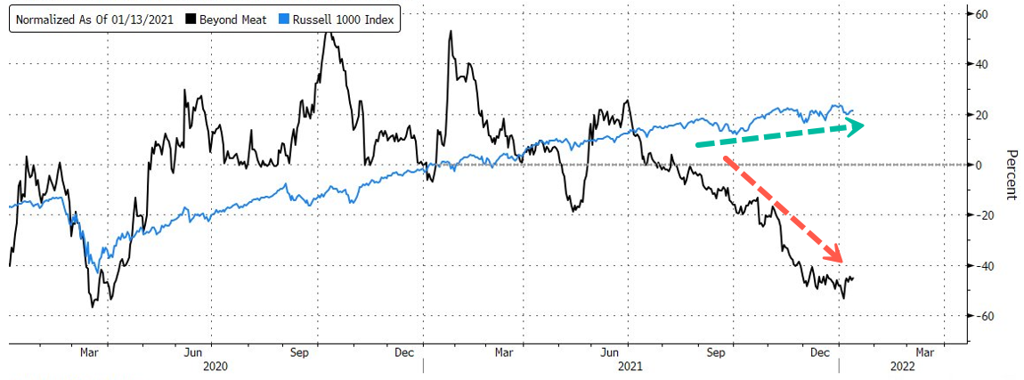 根据专业数据提供商S3 Partners 的数据,截至1月10日,看跌押注占Beyond Meat 自由交易股票的42%,这是美国最大上市公司罗素1000指数中的最高比率。