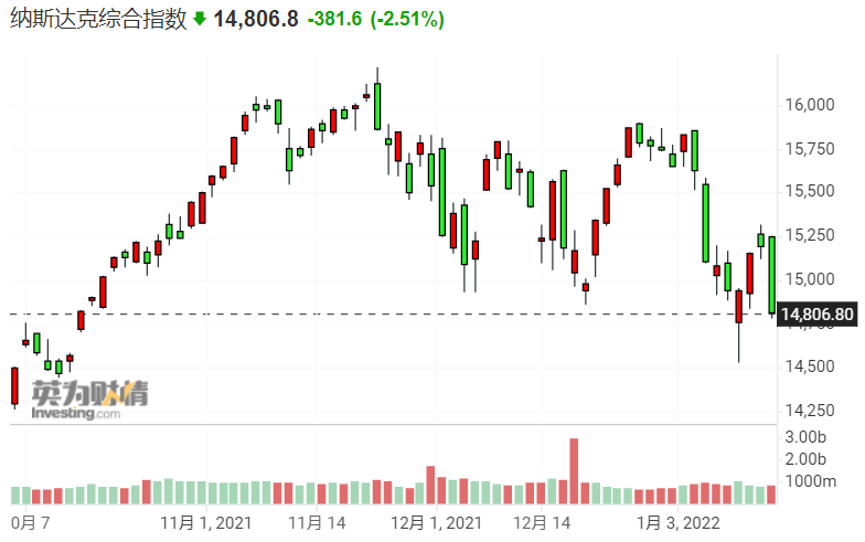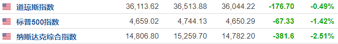 截至收盘,道指跌0.49%,报36113.62点;纳指跌幅2.51%,报14806.80点;标普500指数跌1.42%,报4659.02点。