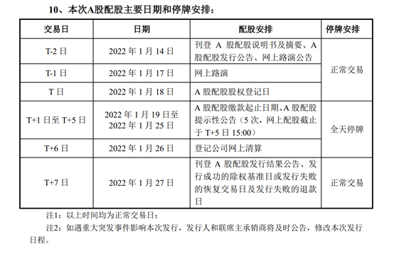 根据公告显示,本次配股拟向截至股权登记日(2022年1月18日)上交所收市后,在中登公司登记在册的公司全体A股股东,按照每10股配售1.5股的比例配售A股股份,配股价格为14.43元/股。1月19日至26日为配股缴款期和网上清算日,中信证券此期间全天停牌。
