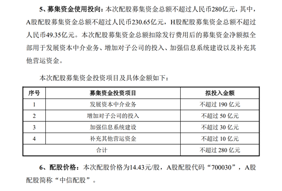 中信证券对本次配股募集资金的具体投向作出说明,其中拟投入不超过190亿元用于发展资本中介业务;不超过50亿元用于增加对子公司的投入;不超过30亿元用于加强信息系统建设;不超过10亿元用于补充其他营运资金。