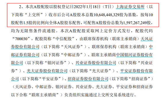 1月13日晚间,中信证券发布A股配股发行公告称,本次A股配股以股权登记日2022年1月18日(T日)上交所收市后,公司A股股本总数106.48亿股为基数,按每10股配售1.5股的比例向全体A股股东配售,可配售A股股份总数为15.97亿股,均为无限售条件流通股。