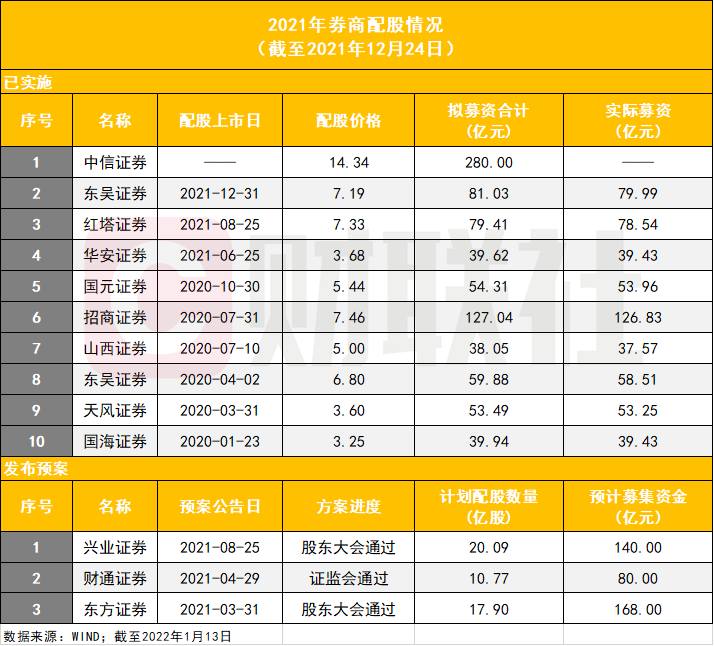 除中信证券外,2020年以来,以配股方式再融资的券商已有12家(共13次),合计配股募资金额为1155.52亿元。中信证券配股实施完成后,还有东方证券、财通证券、兴业证券等3家券商配股案仍在途。