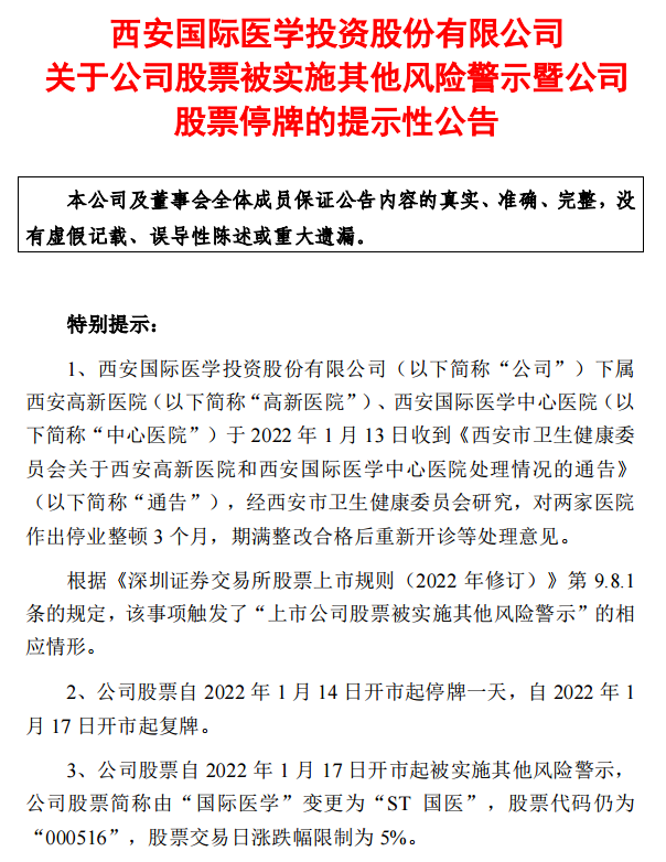 今日晚间,国际医学公告,经西安市卫生健康委员会研究,对两家医院作出停业整顿3个月,期满整改合格后重新开诊等处理意见。根据规定,该事项触发了“上市公司股票被实施其他风险警示”的相应情形。公司股票自1月14日开市起停牌一天,自1月17日开市起复牌。公司股票自1月17日开市起被实施其他风险警示,公司股票简称由“国际医学”变更为“ST国医”。