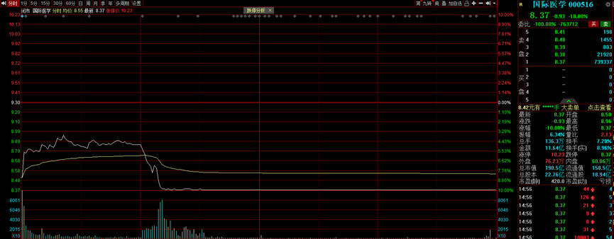 值得注意的是,今日早间,国际医学股价大幅低开逾8%,震荡反弹后最终封死跌停板。截至收盘,还有73万手封单牢牢封住跌停。