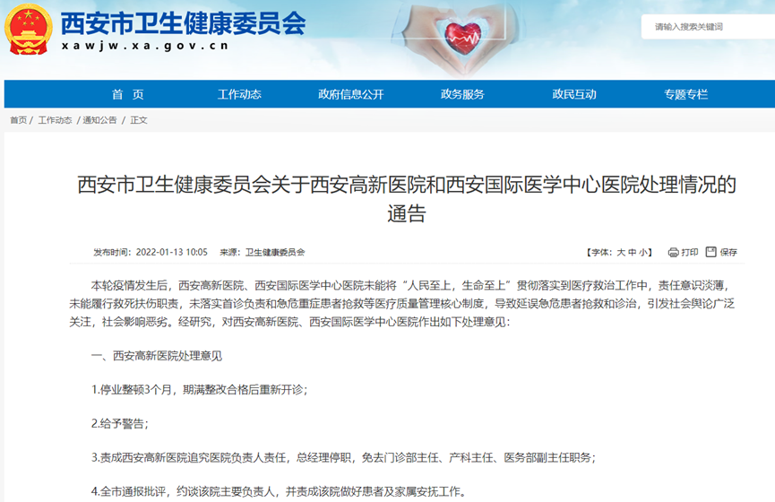 今日上午,西安市卫生健康委员会发布通告称,本轮疫情发生后,西安高新医院、西安国际医学中心医院未能将“人民至上,生命至上”贯彻落实到医疗救治工作中,责任意识淡薄,未能履行救死扶伤职责,未落实首诊负责和急危重症患者抢救等医疗质量管理核心制度,导致延误急危患者抢救和诊治,引发社会舆论广泛关注,社会影响恶劣。经研究决定,即日起西安高新医院、西安国际医学中心医院停业整顿3个月,期满整改合格后重新开诊。