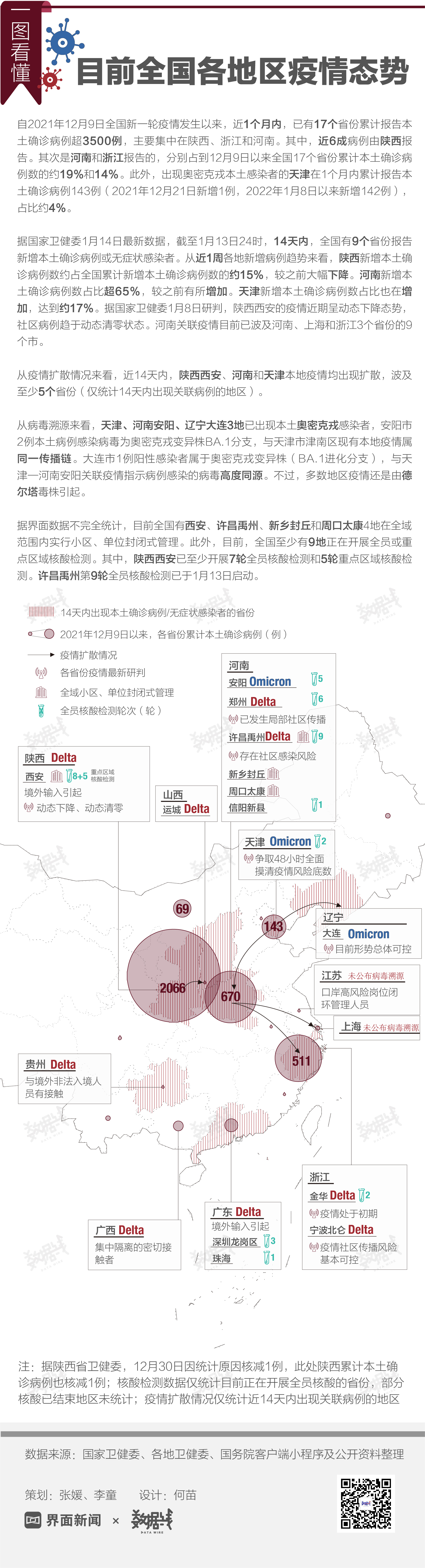 近1个月内,17个省份累计报告本土确诊病例超3500例。截至2022年1月14日10时,全国共有19个高风险地区,59个中风险地区,涉6省份。