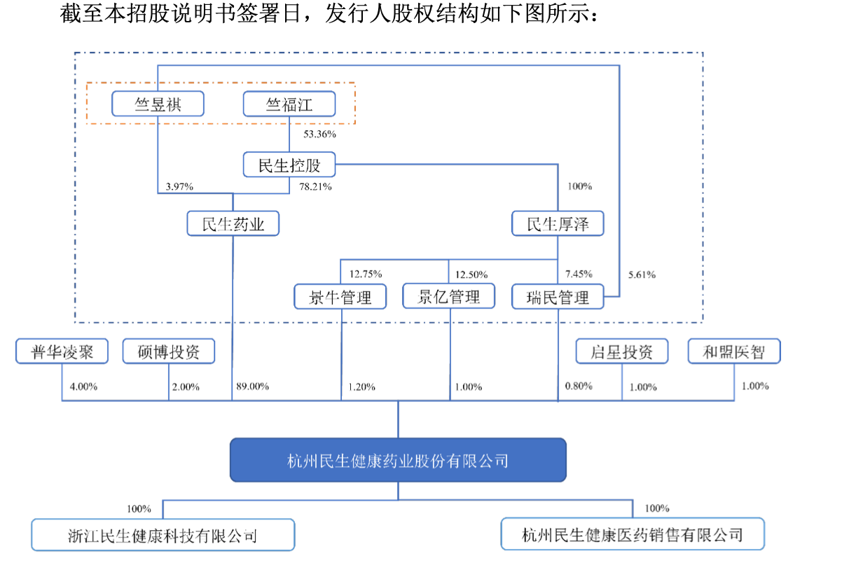IPO前,公司控股股东民生药业直接持有89%的股份;实际控制人为竺福江、竺昱祺父子。竺福江担任公司董事长,通过民生药业、景牛管理、景亿管理、瑞民管理间接控制公司92%的股权;竺昱祺担任公司董事及景牛管理、景亿管理、瑞民管理的管理合伙人民生厚泽执行董事兼总经理,持有民生药业3.97%的股份及瑞民管理5.61%的出资额。