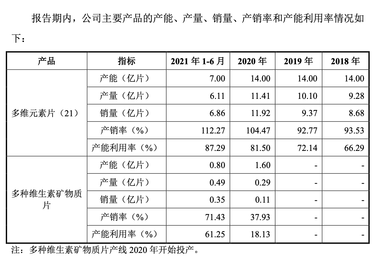产能及利用率情况来看,民生健康多维元素片(21)近三年产能为14亿元片,产能利用率由2018年的66.29%增长至2020年的81.5%,整体增长较快但仍未饱和。但公司并未披露保健食品的产能、产销等情况,报告期内,公司维生素与矿物质系列保健食品分别实现收入131.90万元、504.26万元、1303.90万元和2453.42万元,营收规模相对较小。