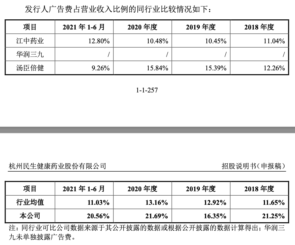 界面新闻记者注意到,公司核心产品盈利能力强劲,报告期内多维元素片(21)的毛利率分别为70.42%、68.38%、67.90%和72.35%;综合毛利率分别为66.94%、66.74%、64.65%和67.93%,基本与同行(江中药业、华润三九、汤臣倍健)的行业均值68.04%、66.53%、63.55%、64.5%保持一致。