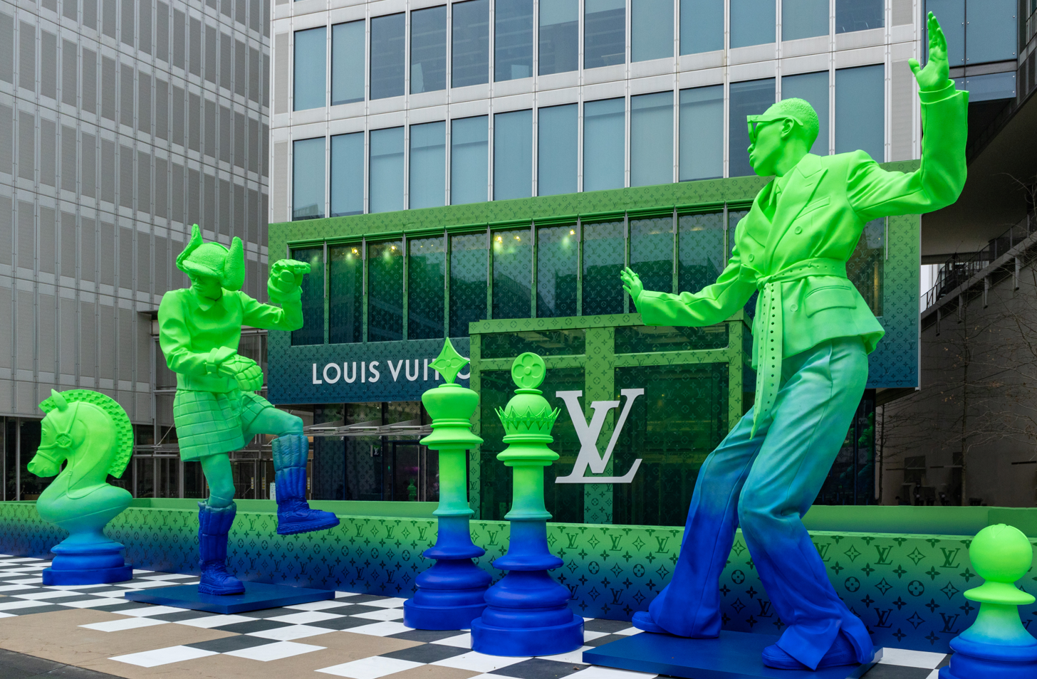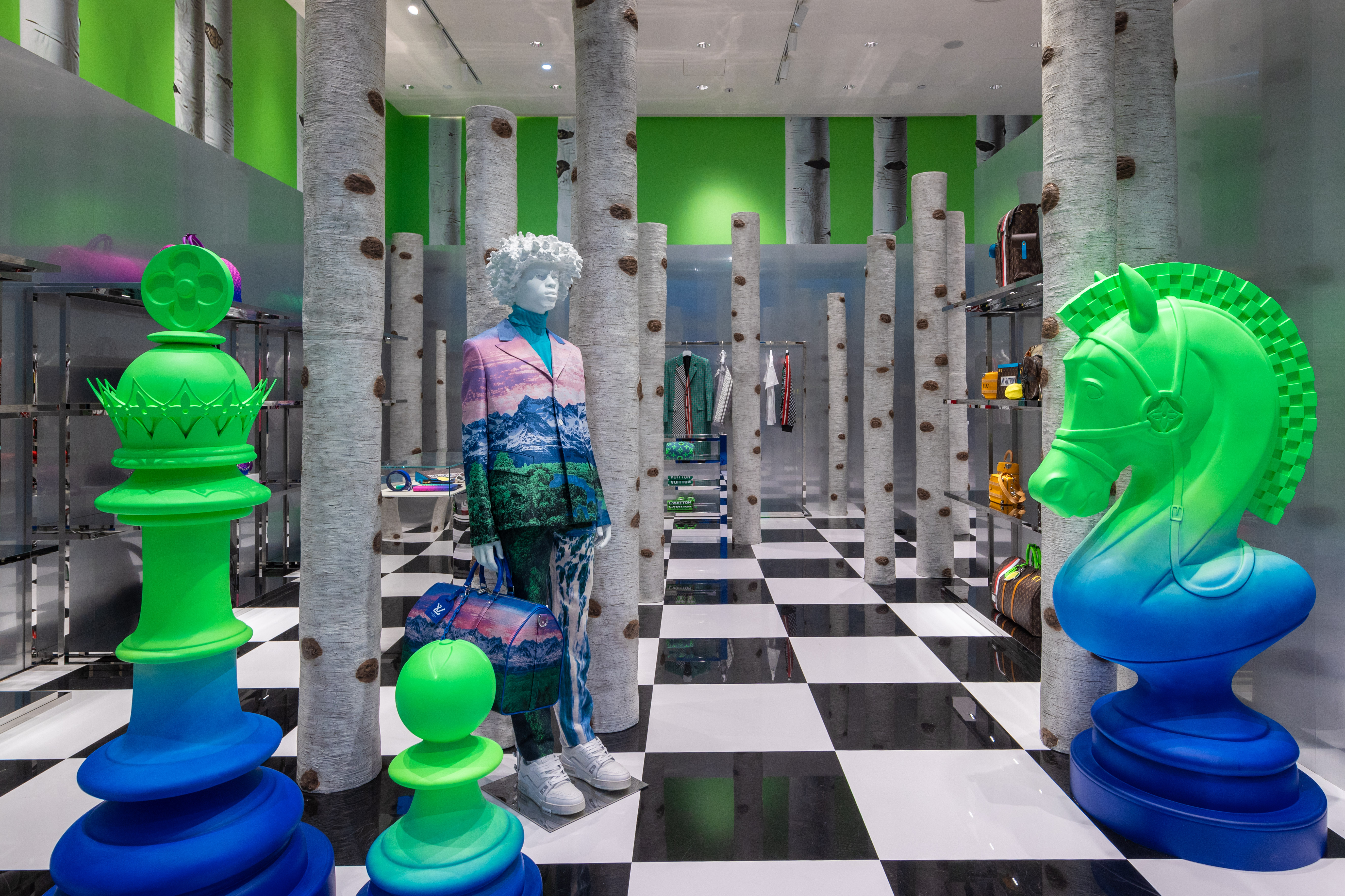 限时空间场地设计灵感源自2022春夏男装秀场的白桦林梦境,作为人类生存古老隐喻的国际象棋棋盘也是此次男装系列的象征。秀场中备受瞩目的造型被放大为户外巨型雕塑,与Virgil Abloh所创作的的丰富造型相互呼应,贯穿于白桦林和棋盘场景之中。