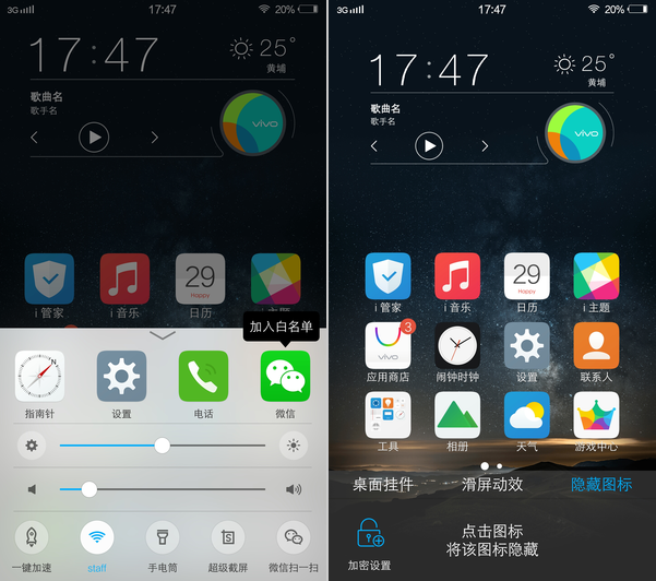 vivo Xplay5配备 4GB RAM和128GB ROM,Xplay5旗舰版在配备了6GB RAM和128GB ROM,都不支持存储卡扩展。vivo Xplay5搭载funtouch OS 2.5(Android 5.1),Xplay5旗舰版则搭载Funtouch OS 2.6(Android 6.0),支持指纹识别、全网通、分屏多任务、应用分身等功能,HiFi 3.0则是Xplay5旗舰版的配置,对于注重音乐体验的消费者来说更有吸引力。