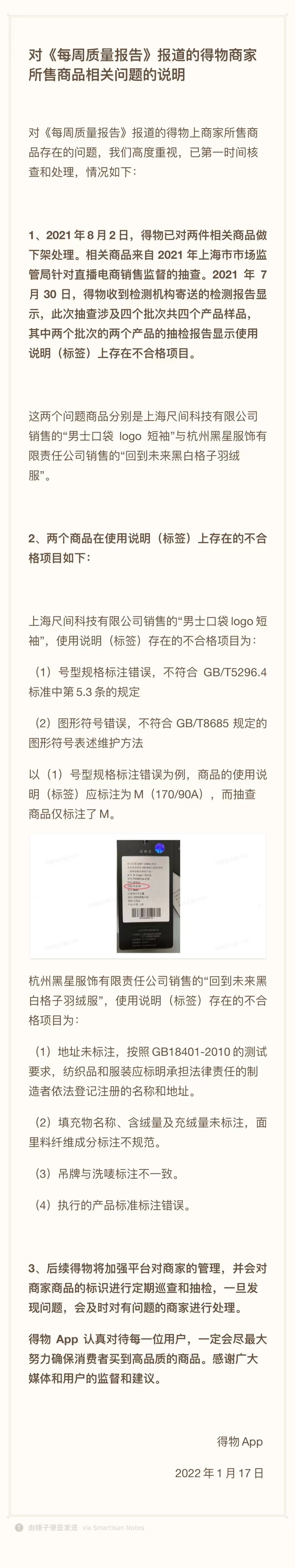 1月17日凌晨,@得物App 发文表示,对媒体报道的得物上商家所售商品在抽查中存在的问题,已第一时间核查。经核查,两款问题商品系标识标注方式不符合最新规定,已先行下架商品。根据品牌方提供的信息,商品本身的产品理化指标和安全性方面符合国家标准。得物后续会加强对商品标识的巡查和抽检。一旦发现问题,会及时对有问题的品牌进行处理。