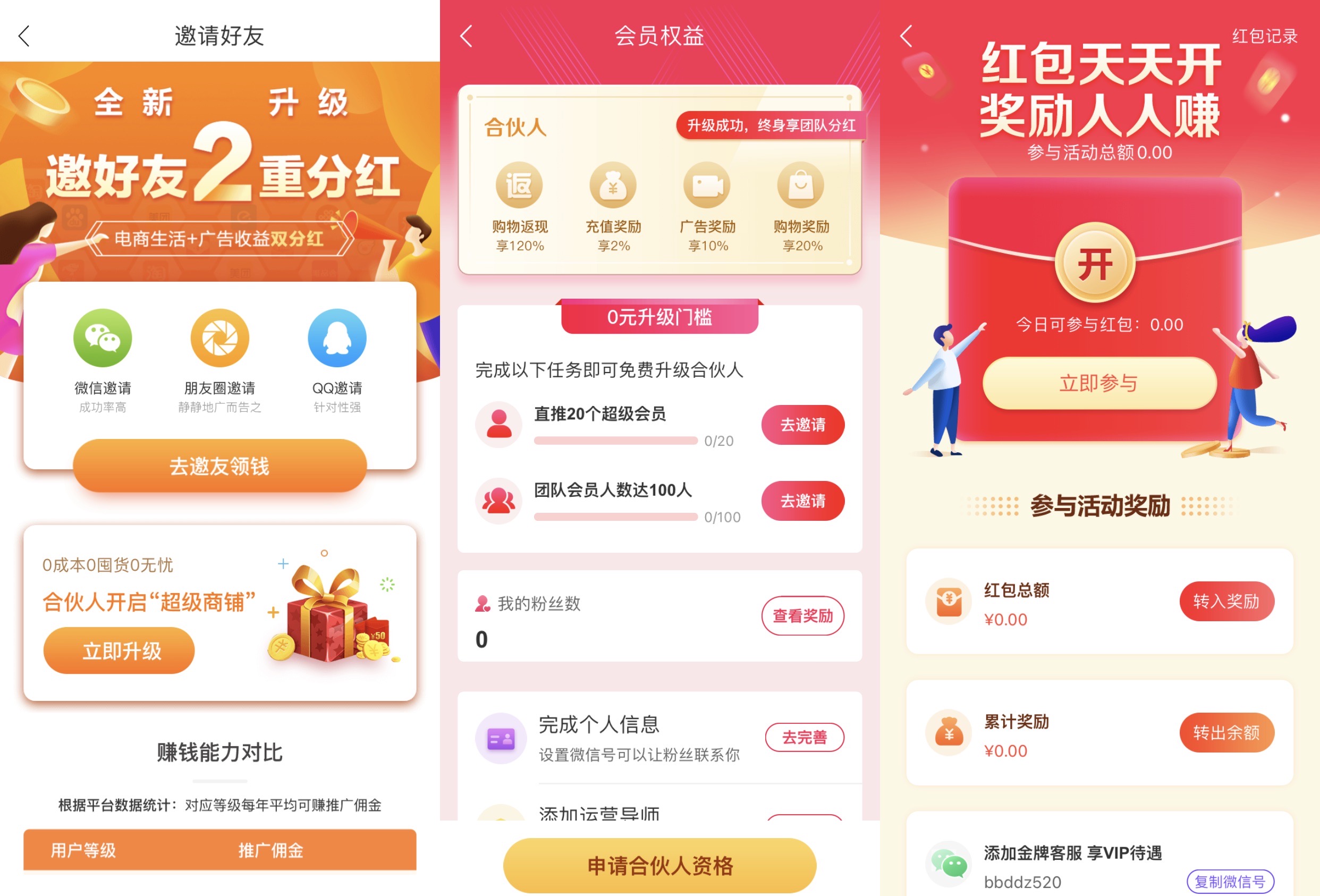 除去利用话费优惠、加油优惠吸引用户,云闪充还有邀人销售机制。其App内发布广告称,用户邀请好友加入软件,可以获得电商生活和广告收益分红,邀请的人越多,会员等级就越高,获得的收益和优惠越多。云闪充还给用户传输“邀请小技巧”,例如把软件分享给家人朋友、分享到3个以上微信群/QQ群成功率最高。