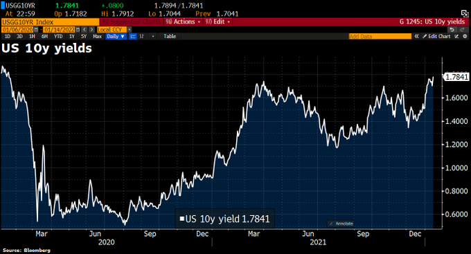 行情数据显示,指标10年期美债收益率在上周经历了一段颇为跌宕的行情,在当周的前四个交易日一度稳步回落,流露出上行遇阻的态势,不过在上周五却再度强势爆发,全天大涨逾8个基点至1.79%上方,创下了2020年1月以来的最高收盘水平。