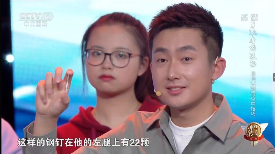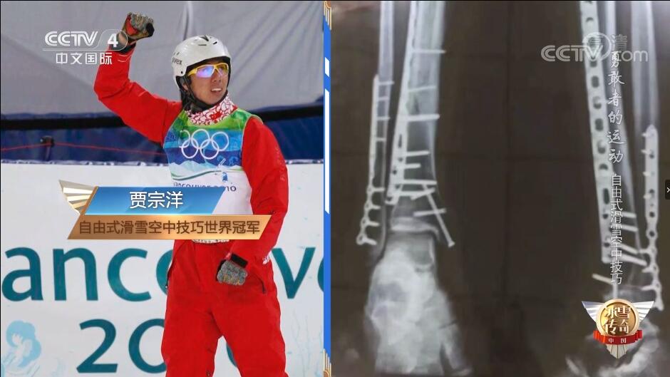 右侧的X光照片是正在备战2022北京冬奥会的空中技巧队老将贾宗洋的左腿照片。贾宗洋在备战2018年平昌冬奥会期间意外受伤,左腿粉碎性骨折,断成了三截。为了能够赶上平昌冬奥会,他在腿里面做了钢钉支架。这样的钢钉最短的估计有三厘米多,长的有四五厘米,贾宗洋的左腿上有22颗这样的钢钉,他就是带着这些钢钉参加的平昌冬奥会。